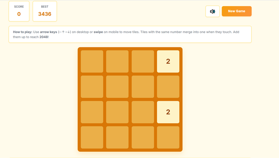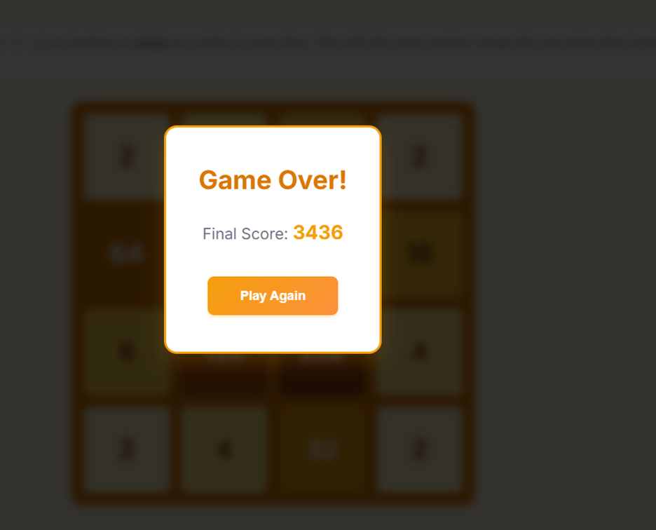 - Game Over: The game ends when the 4×4 board is full of numbers and no more merges are possible.