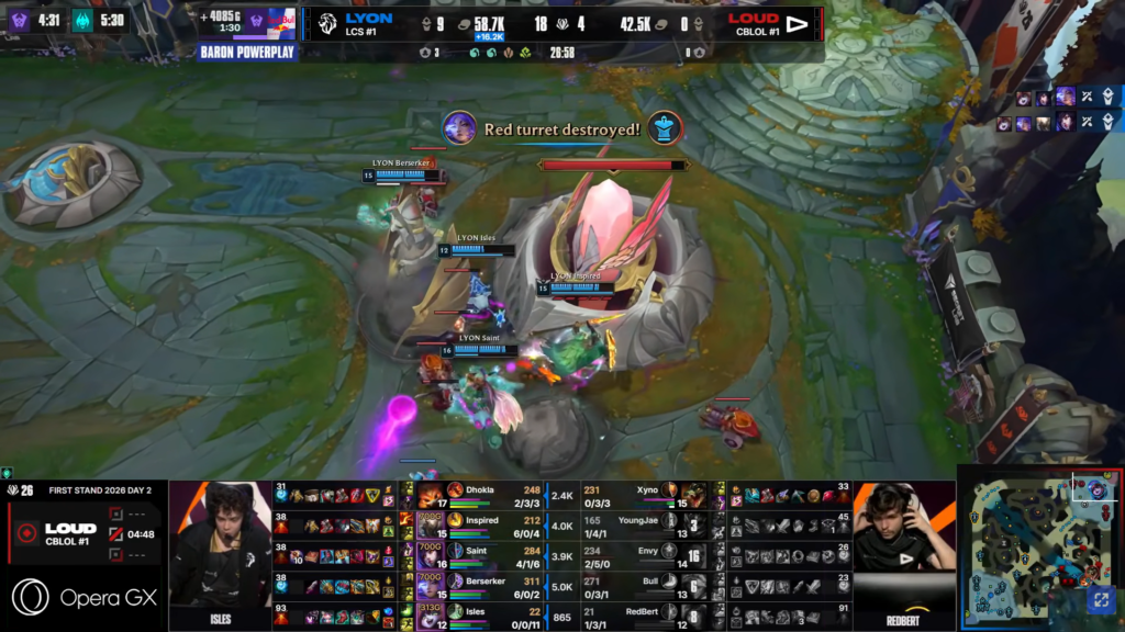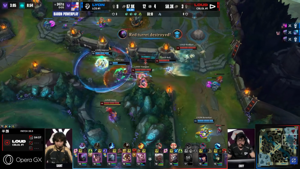 At minute 23, LYON secured the first Baron and used it to dismantle LOUD’s structures. A mid-lane teamfight resulted in three kills for LYON, giving them full control.