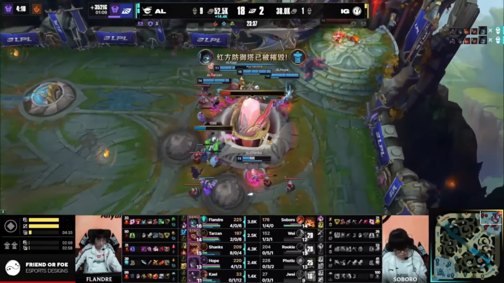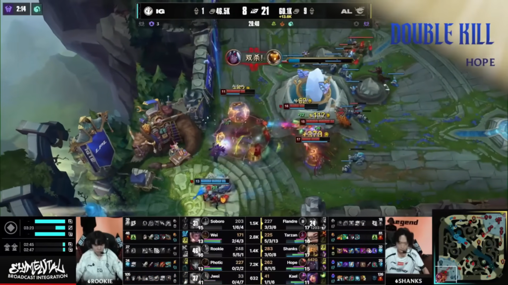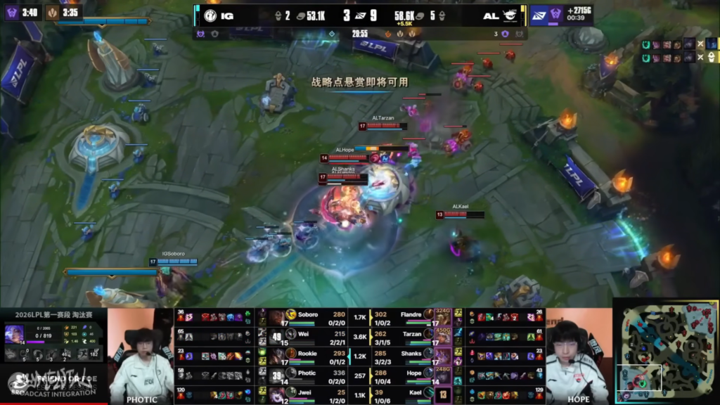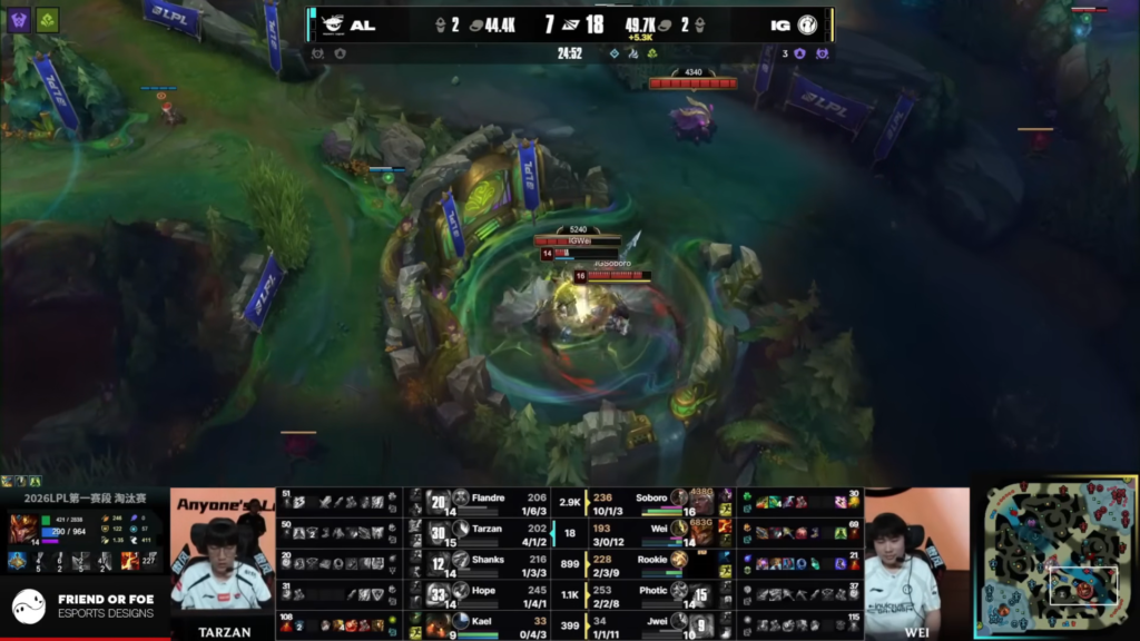 Because of this early activity, AL’s solo lanes quickly gained advantages. Meanwhile, IG struggled to stabilize the early game.