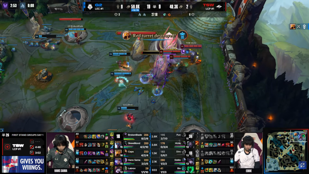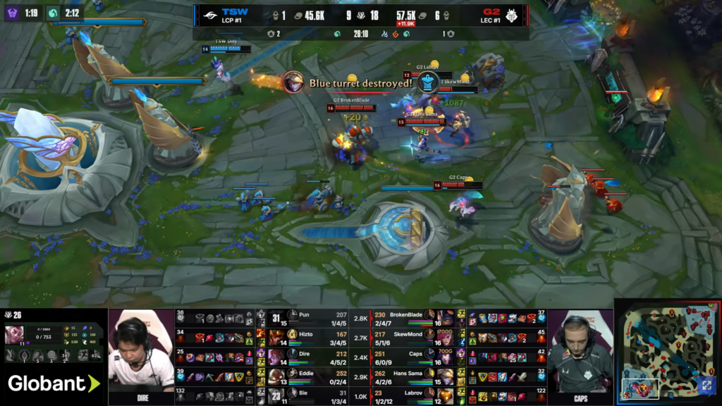 In the early game, Caps quickly gained an advantage in mid lane. At the same time, G2’s jungler Skewmond applied constant pressure across the map, especially toward the top side. Consequently, TSW gradually lost control of vision.