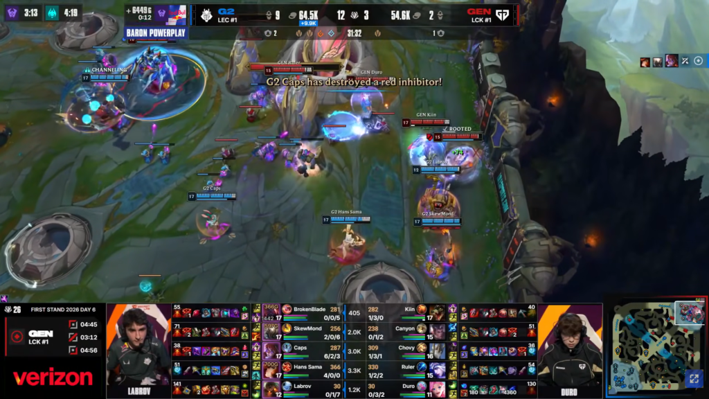 With Baron, G2 ran a 1-3-1 setup. As a result, they forced fights in tight areas. Meanwhile, Gen.G could not defend effectively.