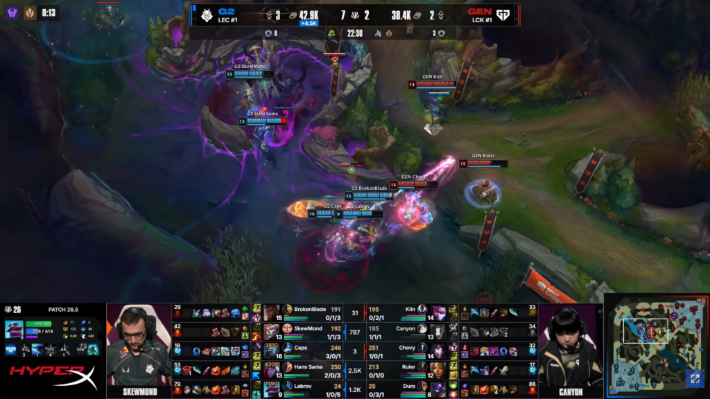 Once again, G2 had the stronger early game. They actively contested early dragons and secured First Blood in a small skirmish. From there, they quickly took control of both jungles and applied pressure across all lanes. Gen.G began to lose control of the game’s tempo.