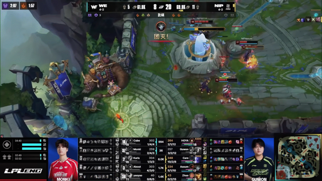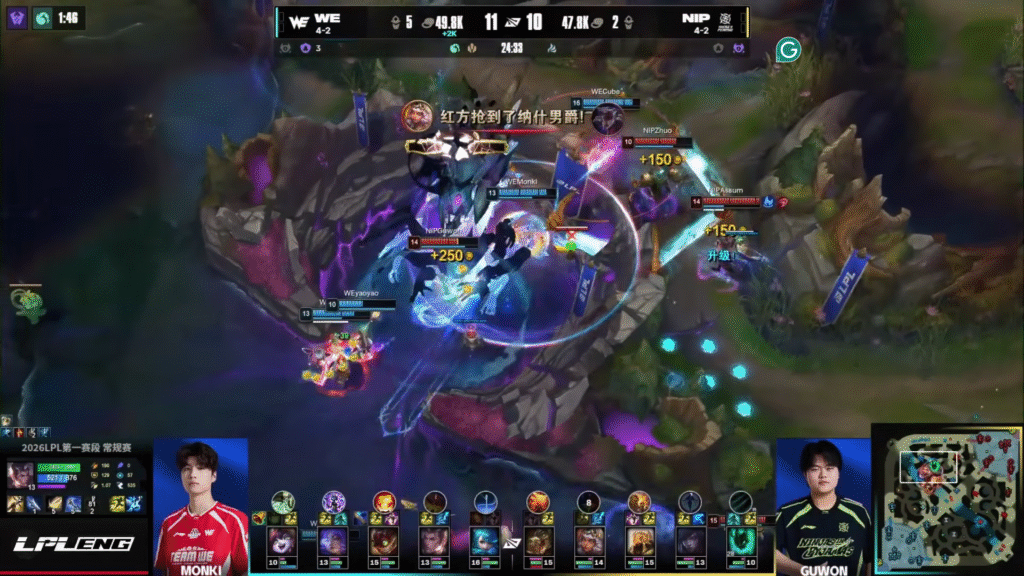 After that, WE were forced into a defensive posture. At the same time, NIP continued to pressure objectives. A major teamfight broke out around the Dragon pit. Because of their stronger teamfighting composition, NIP won decisively. In addition, they took down three WE members and secured their second Dragon. As a result, the gold lead quickly grew to over 5,000.