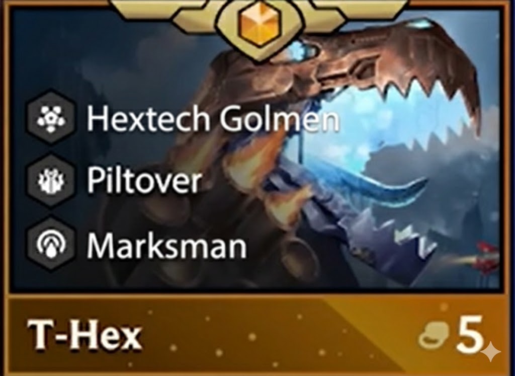 T-Hex is a powerful 5-cost long-range machine capable of firing continuous barrages, lasers, and rockets. With both consistent DPS and explosive multi-target damage, T-Hex excels in sustained fights and scales heavily with Attack Speed and AD items.