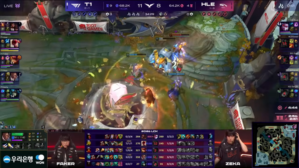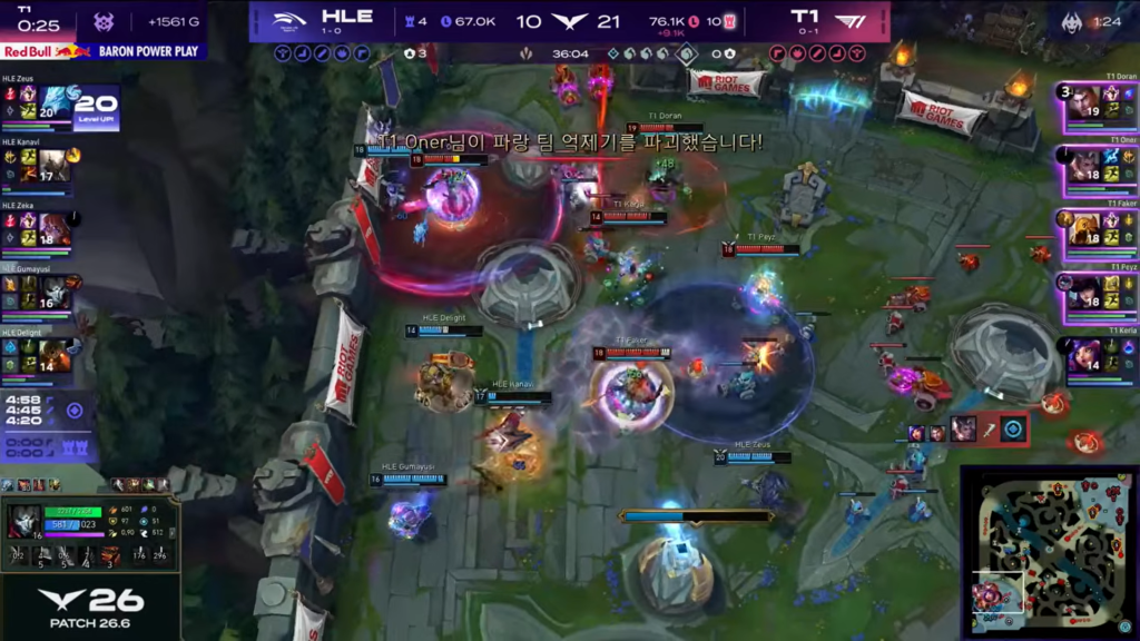 At the same time, T1 maintained strong vision control around the river and secured early objectives. HLE struggled to respond effectively and failed to execute counter-ganks.