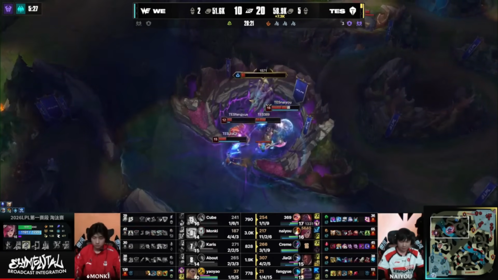 Later, at minute 25, TES secured Baron. Immediately afterward, they pushed mid lane together. Finally, TES won a decisive teamfight and wiped WE. Therefore, TES closed Game 1 with full control.
