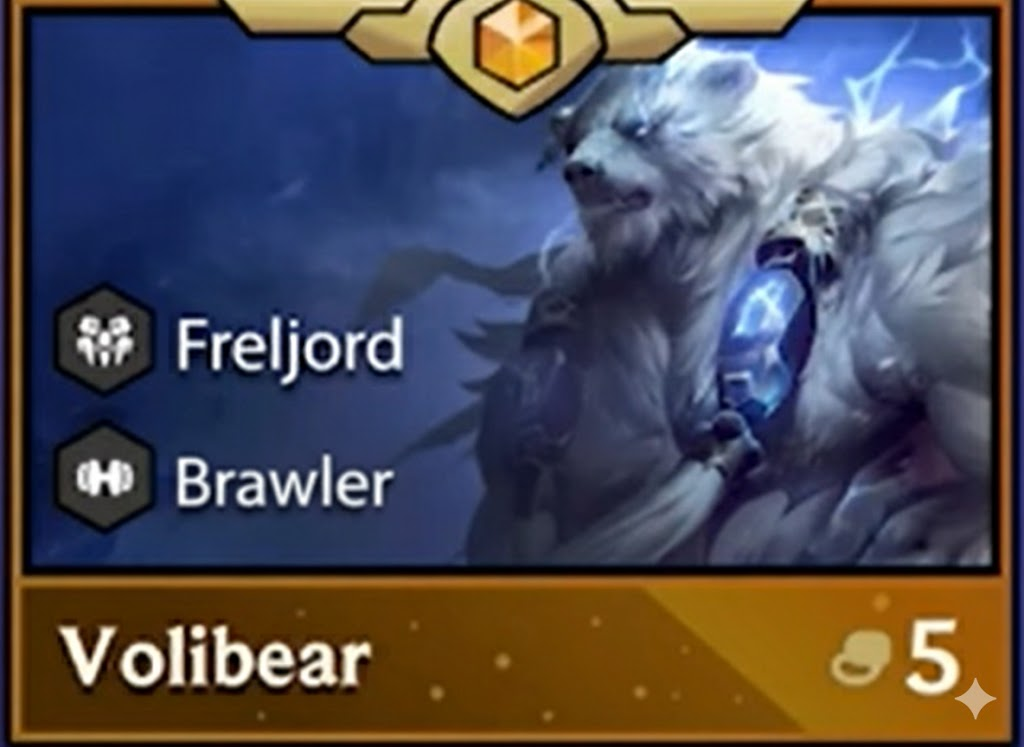 Volibear is a powerful bruiser-style 5-cost champion who marks enemies, leaps across the battlefield, and unleashes a raging storm that deals heavy physical and magic damage. Once fully empowered, Volibear becomes a destructive frontline carry capable of chaining lightning across enemies.
