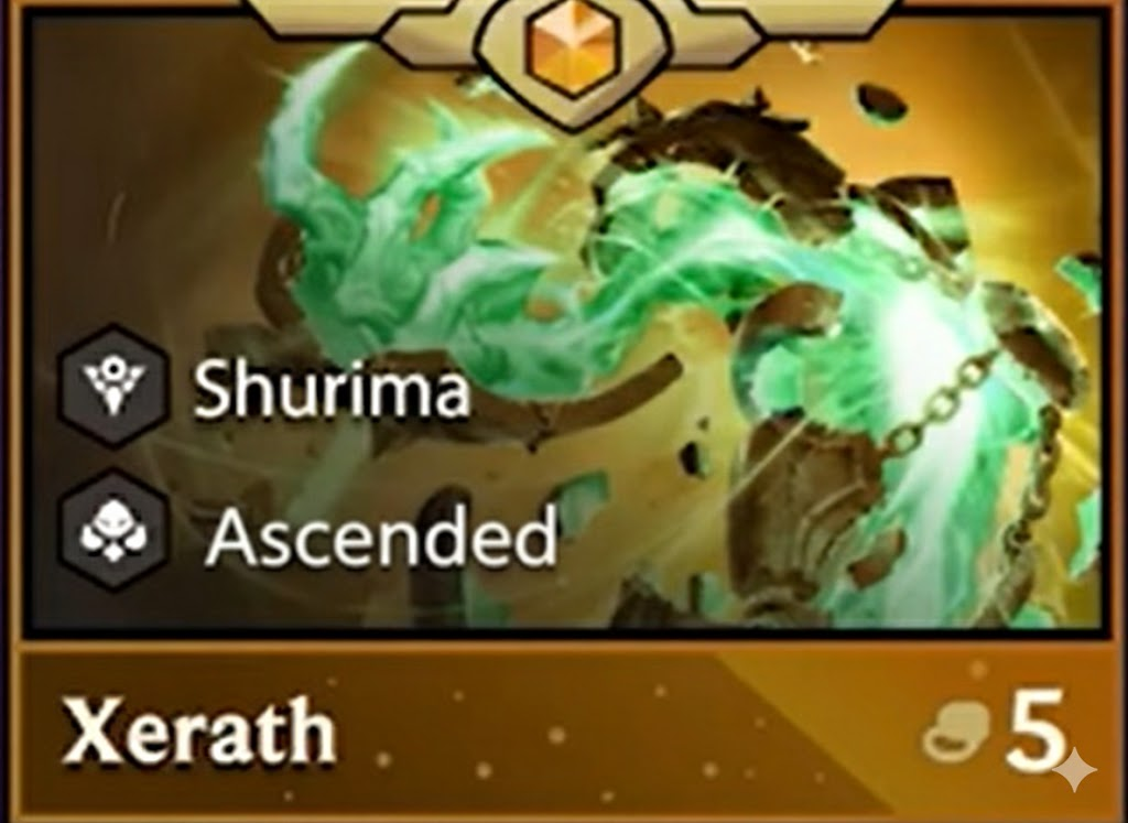 Xerath is a devastating 5-cost AP artillery unit with extremely powerful wide-area damage. His ability, Eye of the Ascendant, unleashes dozens of magical beams onto multiple enemies simultaneously, allowing him to wipe entire boards—especially when empowered by the Ascended trait.